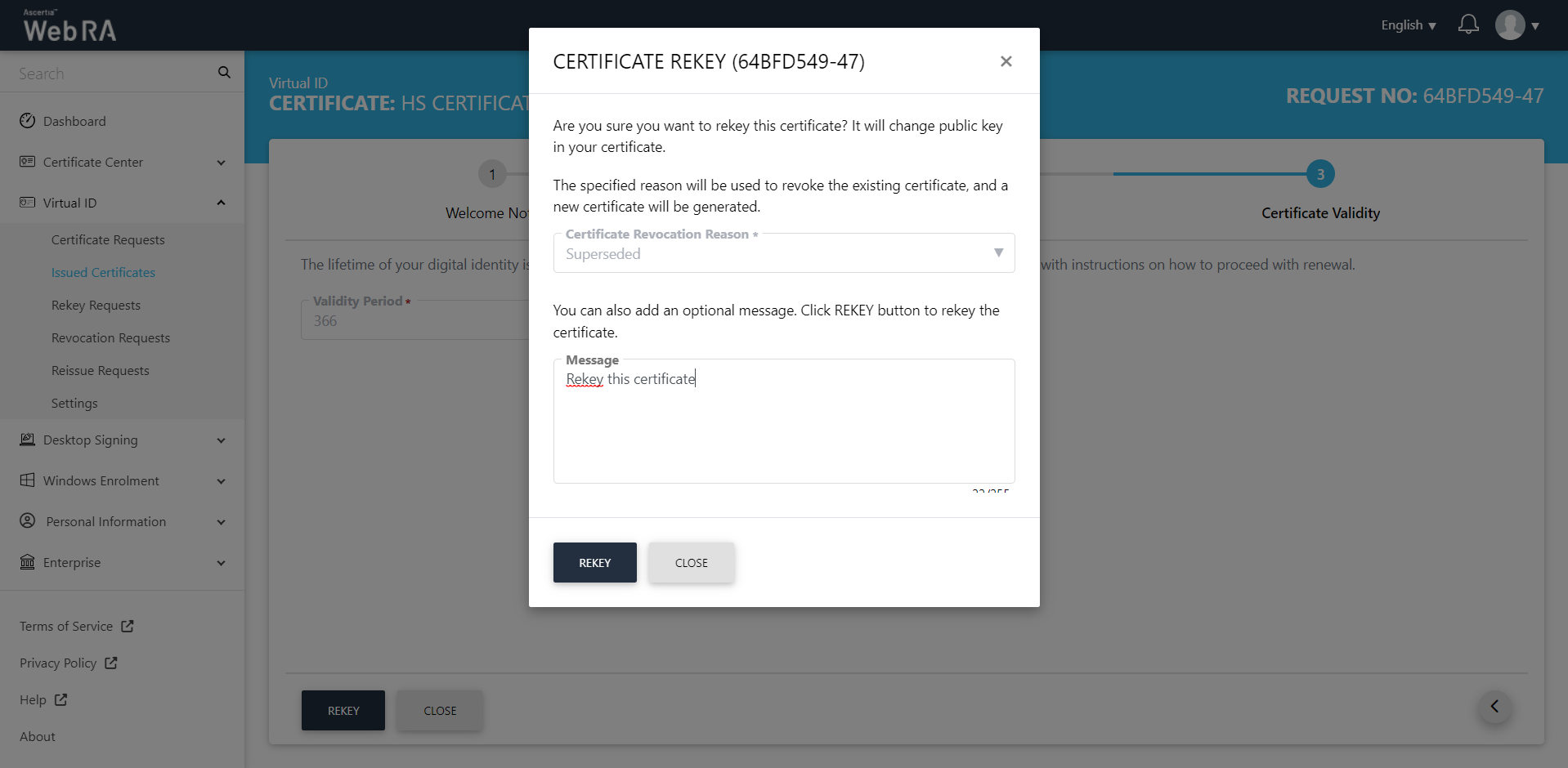 Click Rekey, a certificate rekey confirmation will appear. You can enter an optional message, then click Rekey.