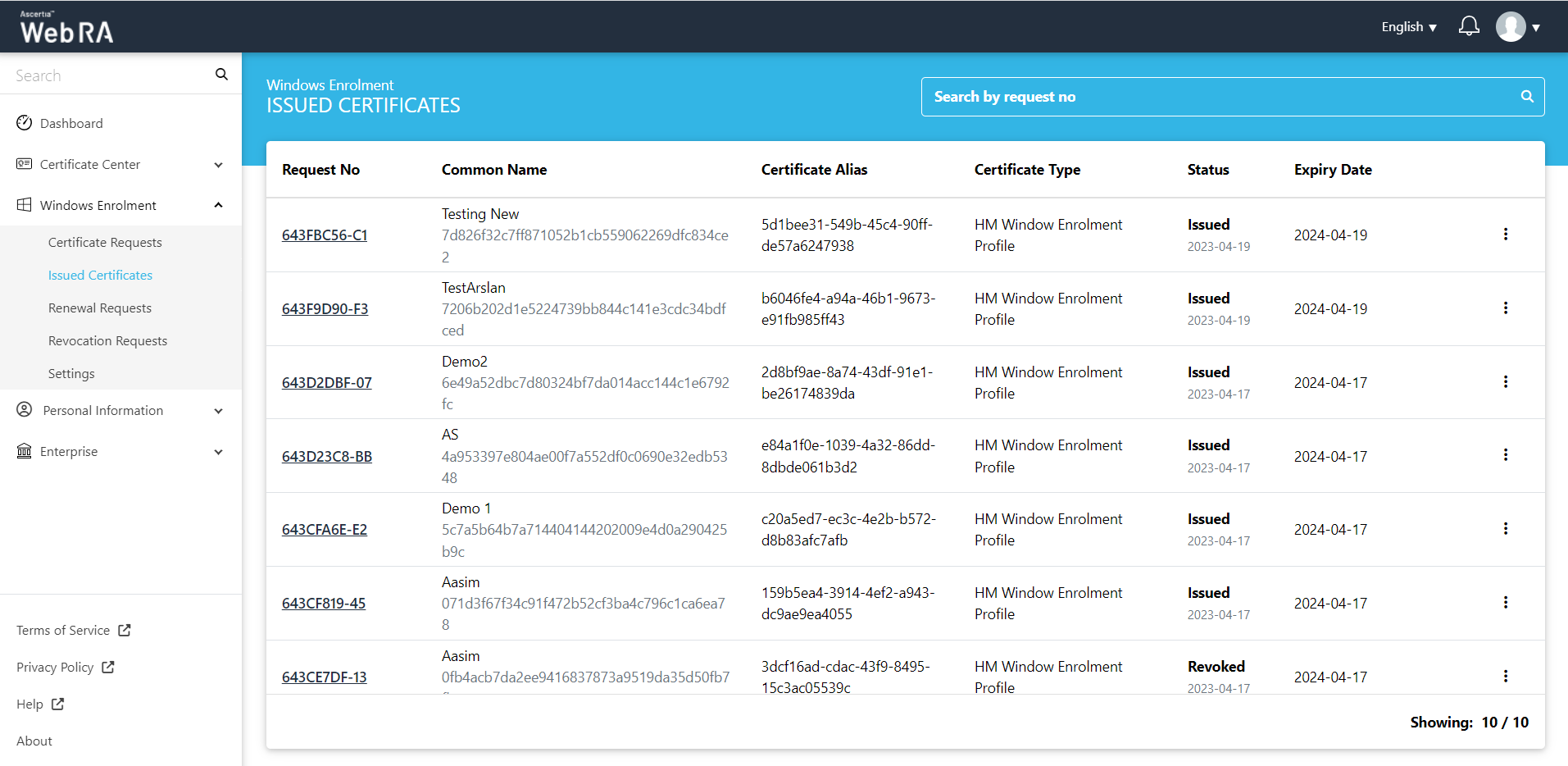 This section lists down all certificates issued to Windows enrolment.
