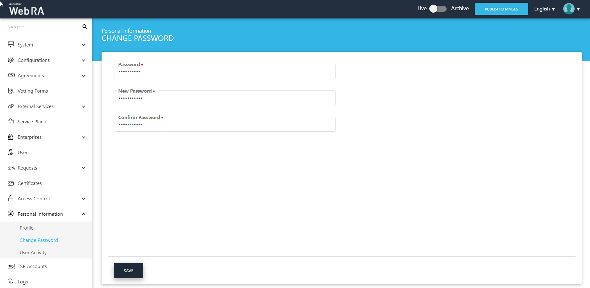 If the Enable password protection as a second factor authentication for administrators with the TLS client authentication check box is selected in the Configurations > General Settings, then a user will be able to change password from the Administrator's Portal (Personal Information > Change Password).