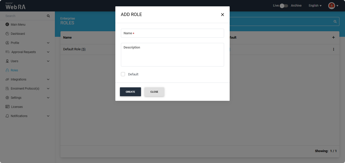 Enter the required name and description (optional) of the role. You can set the role to be used as default by enabling the ‘Default’ checkbox.