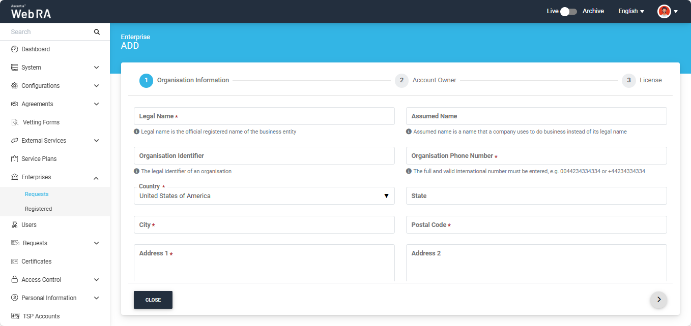 To create a new enterprise and configure the Service plan to it, expand Enterprises > Requests > Add (+) to access the ADD enterprise screen.
