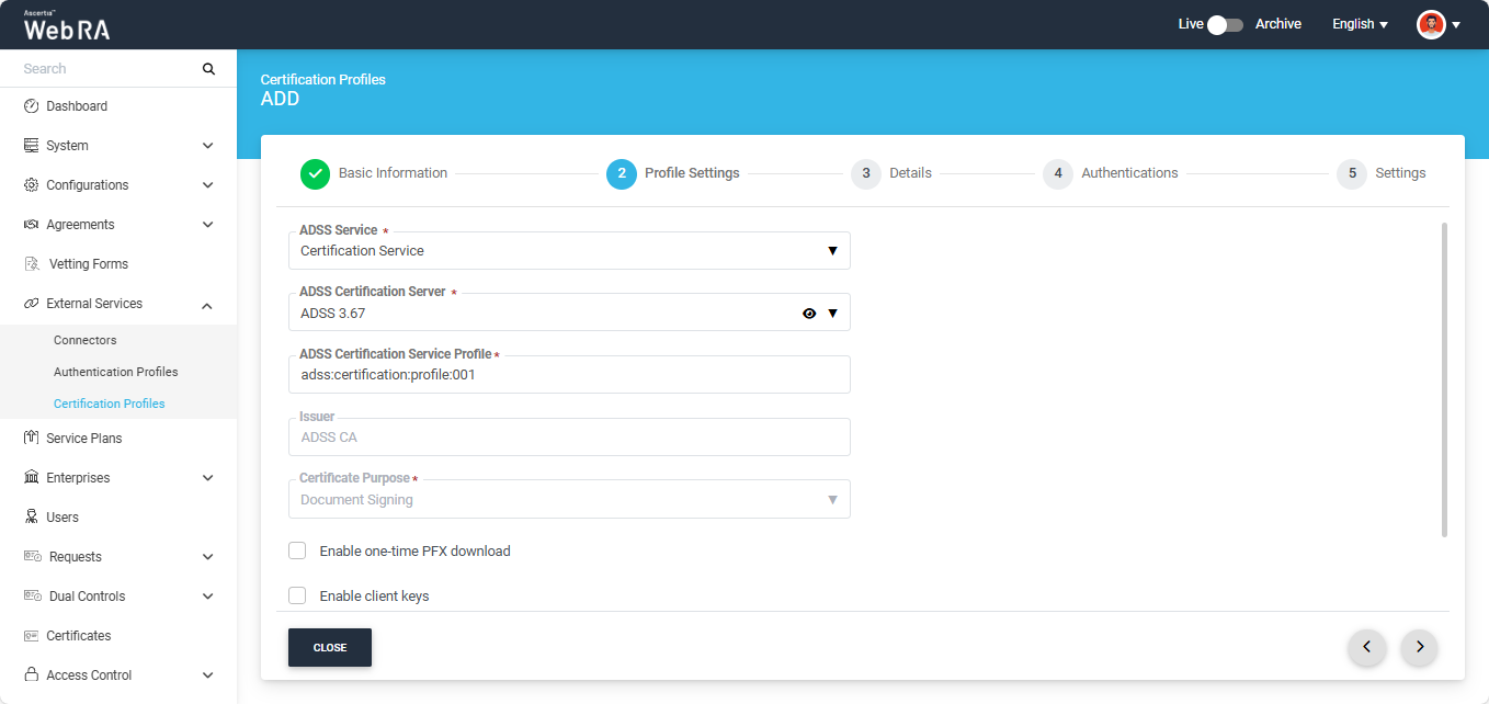 Certification profiles define all the necessary configurations and business requirements, such as CA details, key algorithm, and validity, to issue the corresponding certificates for ADSS Web RA users.