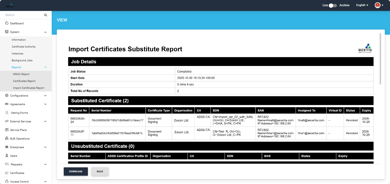 Once the job has been successfully executed, a report will be generated and will appear in the 'Import Certificates Report' page under the 'Systems > Reports' section.