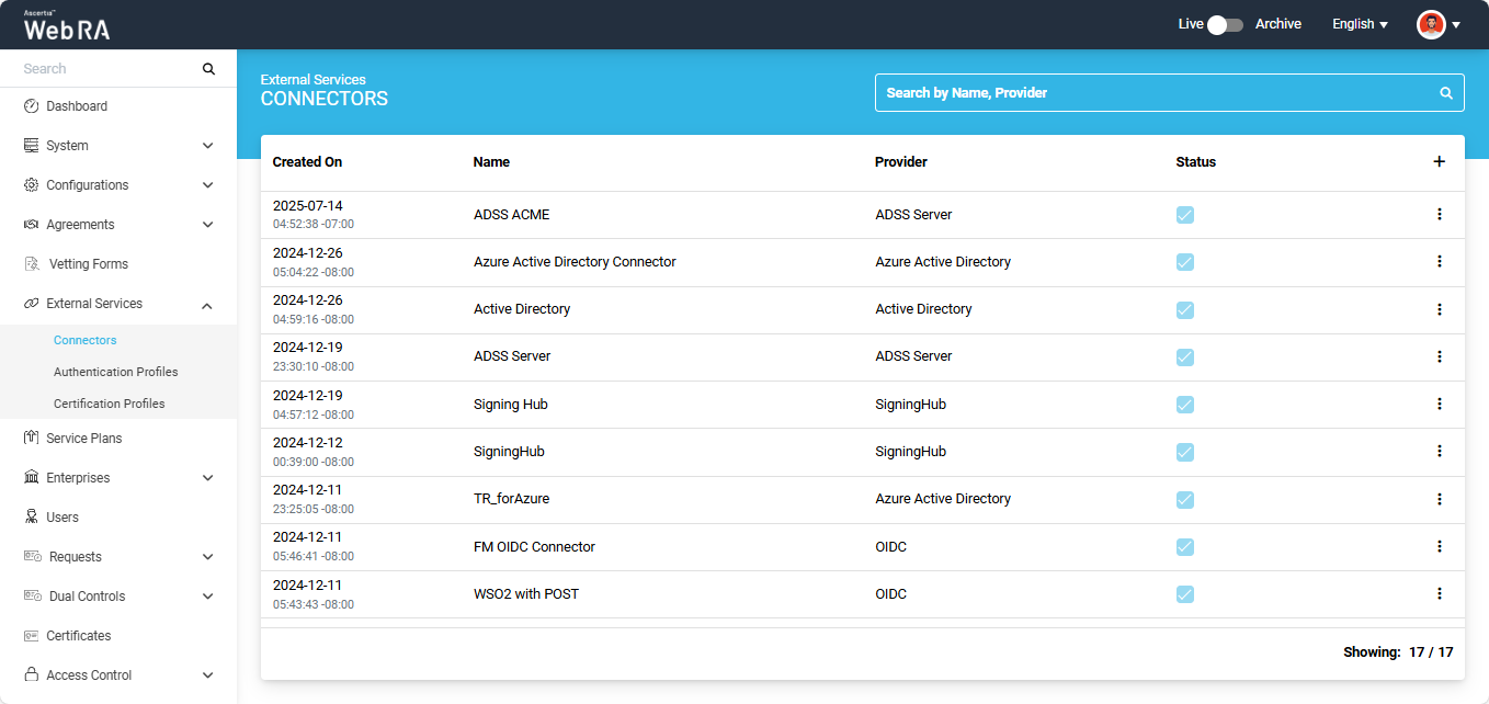 To view the complete details on creating different types of connectors in ADSS Web RA, refer to the 'Connectors' section.