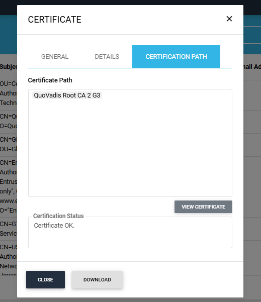 To download the certificate, click the ‘Download’ button at the bottom of the ‘Certificate’ popup box.