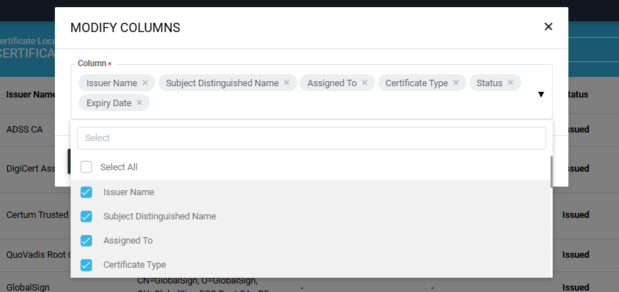 Click on the ‘Modify Columns’ option to edit the table column entries. This will open a ‘Modify Columns’ dialog.