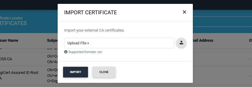 To import external CA certificates into the system, upload the CSV file by clicking on the upload button. Then click ‘Import’.