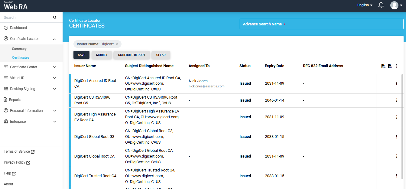 If a user has applied an advanced search filter and wants to create a report of all the certificates that appear based on that search, they can use the ‘Schedule Report’ option.