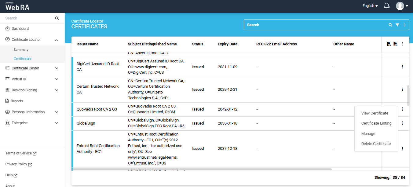 Users can delete a certificate by selecting the ‘Delete Certificate’ option, which appears when they click the