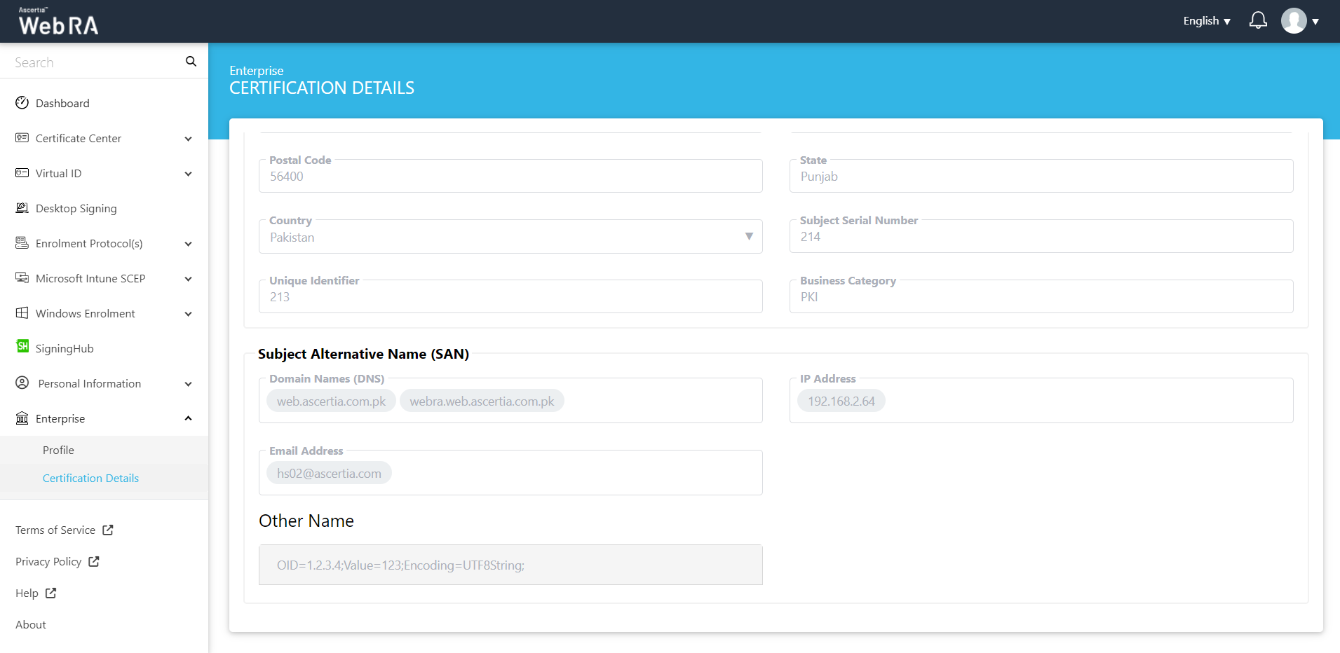 This section in the ADSS Web RA web portal certification details (SANs, SDNs and certificate sharing details) that are defined for a user in his role.