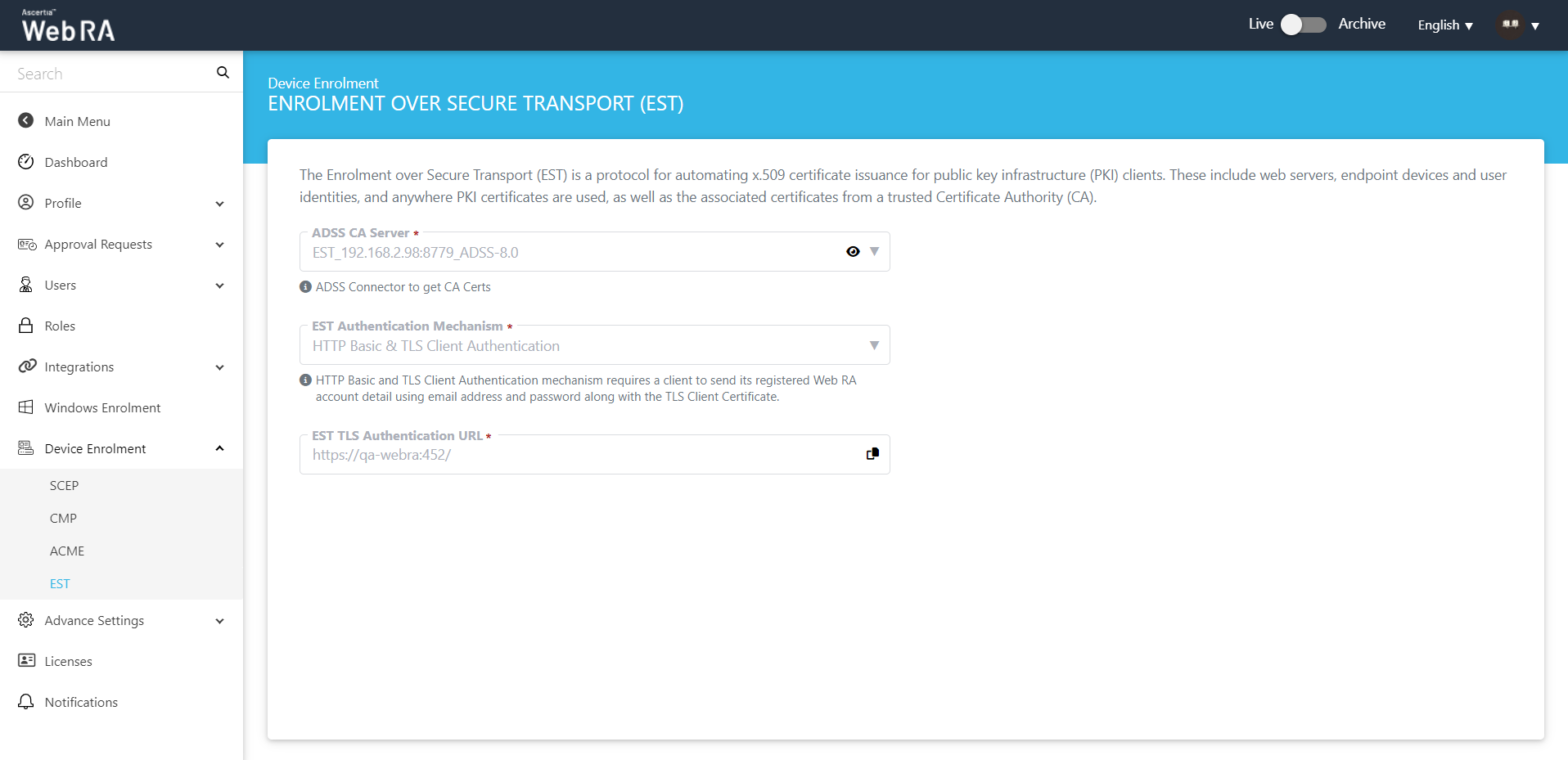 The Enrolment over Secure Transport (EST) is a protocol for automating x.509 certificate issuance for public key infrastructure (PKI) clients. These include web servers, endpoint devices and user identities, and anywhere PKI certificates are used, as well as the associated certificates from a trusted Certificate Authority (CA).