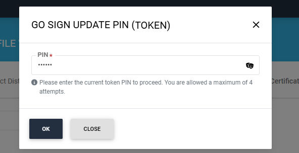Once you click submit, a dialog titled ‘Go Sign Reset Token’ will appear. This dialog will display the auto-generated value of PIN in disabled form. The user can view and save the value from the respective icons.