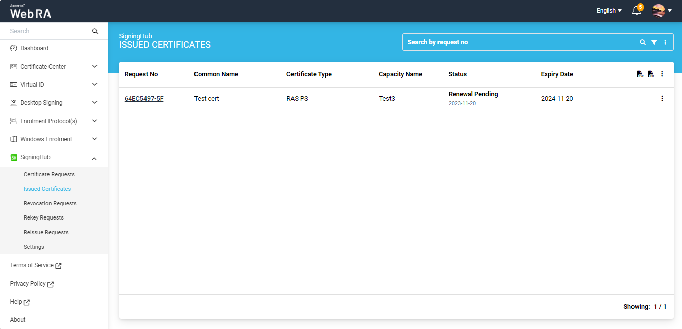 On the web portal, expand SigningHub > Issued Certificates from the left menu pane. The following screen will be displayed: