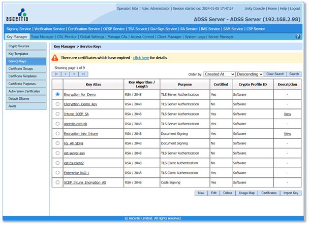 - Access the ADSS Server. From the main menu, click the Key Manager > Service Keys.