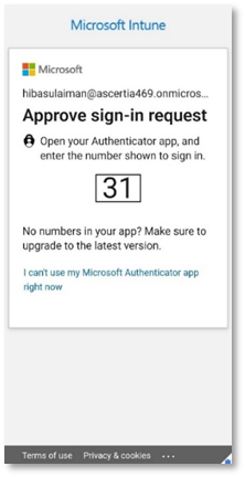 - Login to the Authenticator app and sign-in with your Microsoft Intune user credentials. Open the Authenticator app on your device and approve with the prompted verification code. Refer to section 6.1 point 4 to see the Microsoft Authenticator configurations.