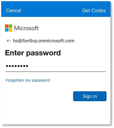 - Entering your email e.g. HS@5xr6vp.onmicrosoft.com
