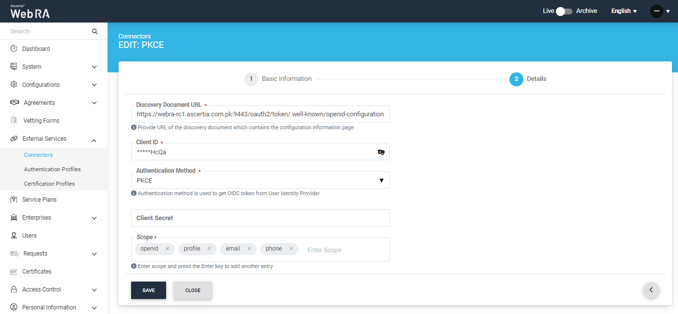 A connector is required in ADSS Web RA Admin to communicate with OpenID Connect (OIDC).