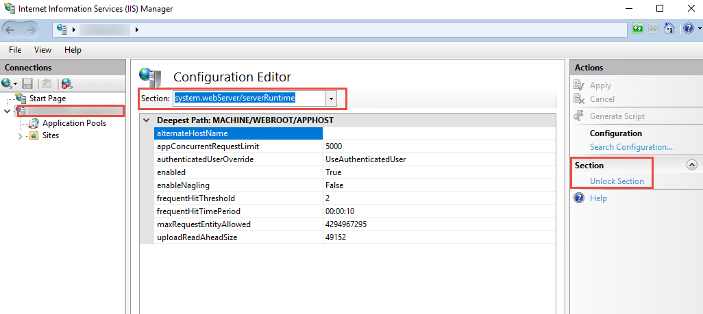 Unlock system.webServer/serverRuntime section in configuration editor of IIS.