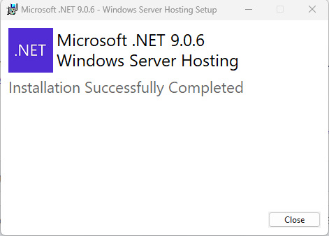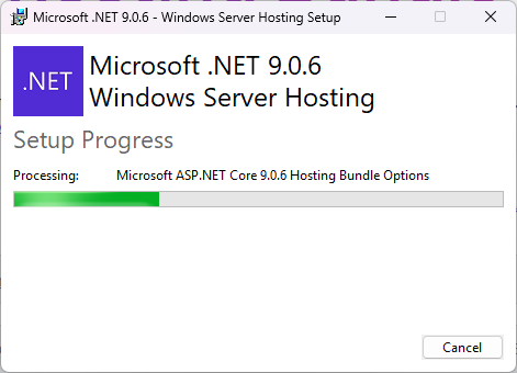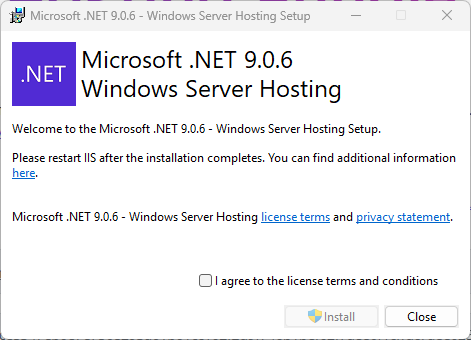 Once downloaded, execute the installer by executing dotnet-hosting-9.0.6-win.exe