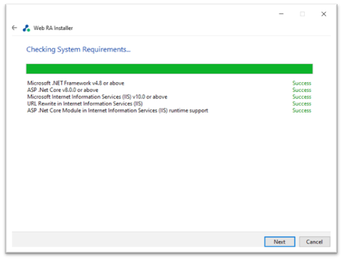 Click the "Next" button to continue. The system requirements screen will appear next to validate if all the required prerequisites are installed.