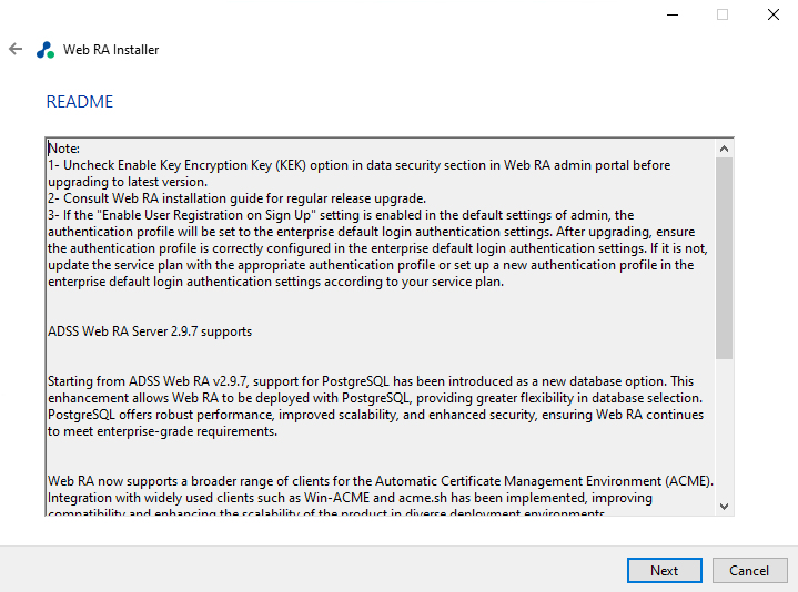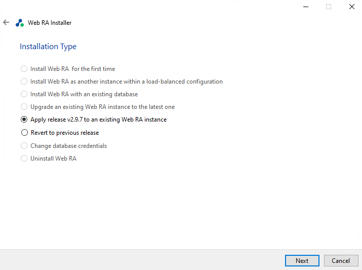 Note: The ‘Regular Release” installation type will only be available if ADSS Web RA was previously installed with Microsoft SQL Server database. This option is not available for PostgreSQL database, as it will be freshly supported starting from v2.9.7.