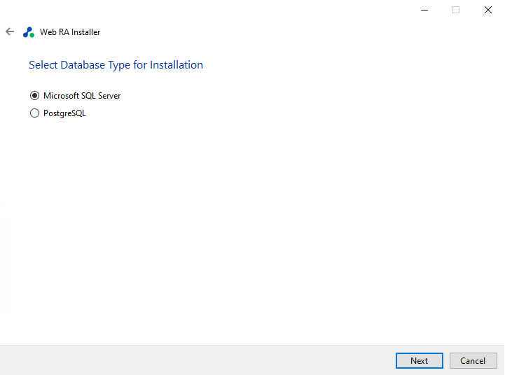 Click the Next button to continue to the database type screen. Select the database type – Microsoft SQL Server or PostgreSQL – that was used in your previous Web RA installation.
