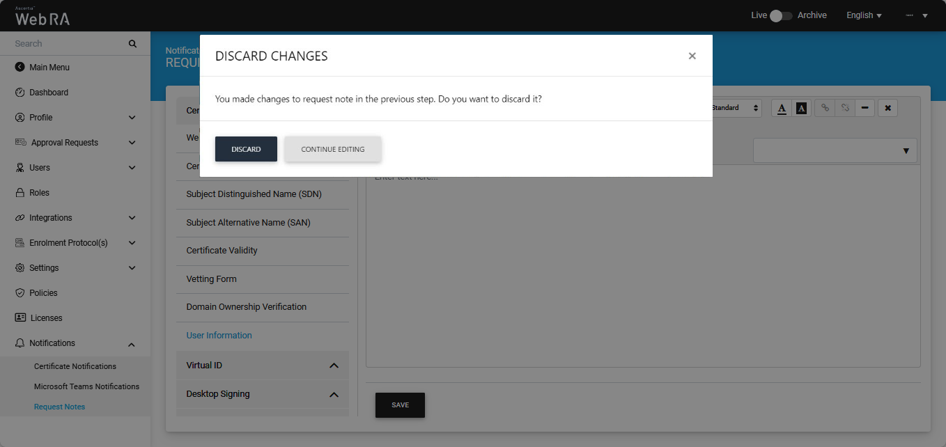 An administrator can add request notes to any of the above modules from ADSS Web RA admin portal, that will be visible on the ADSS Web RA web portal.