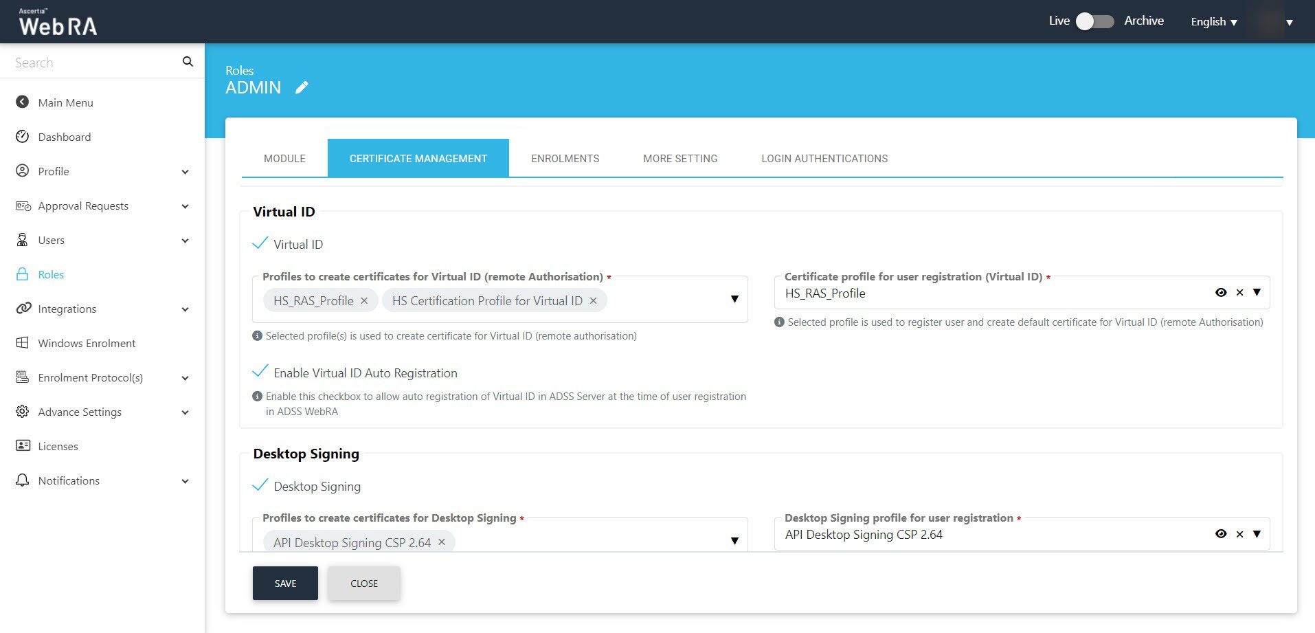 Select this check box to allow auto registration of Virtual ID in ADSS Server while user registration in ADSS Web RA Server. |
