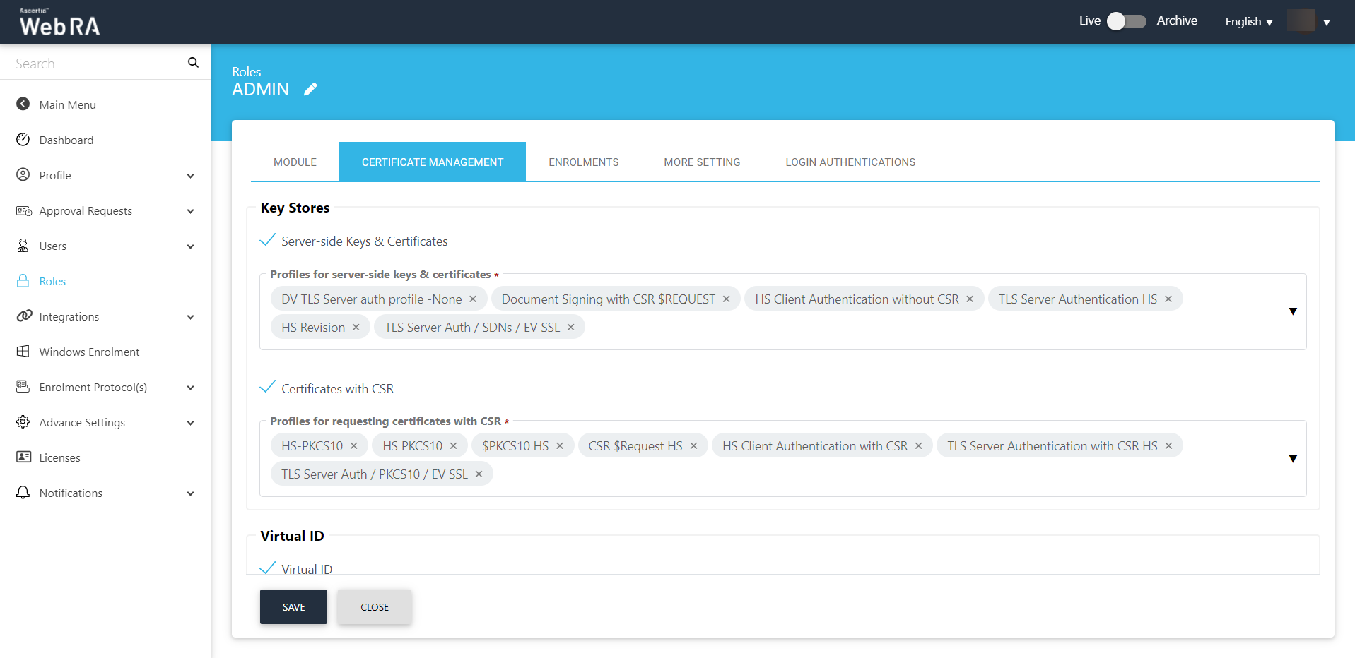 Select the profiles that you want to use to create Virtual ID certificates. |