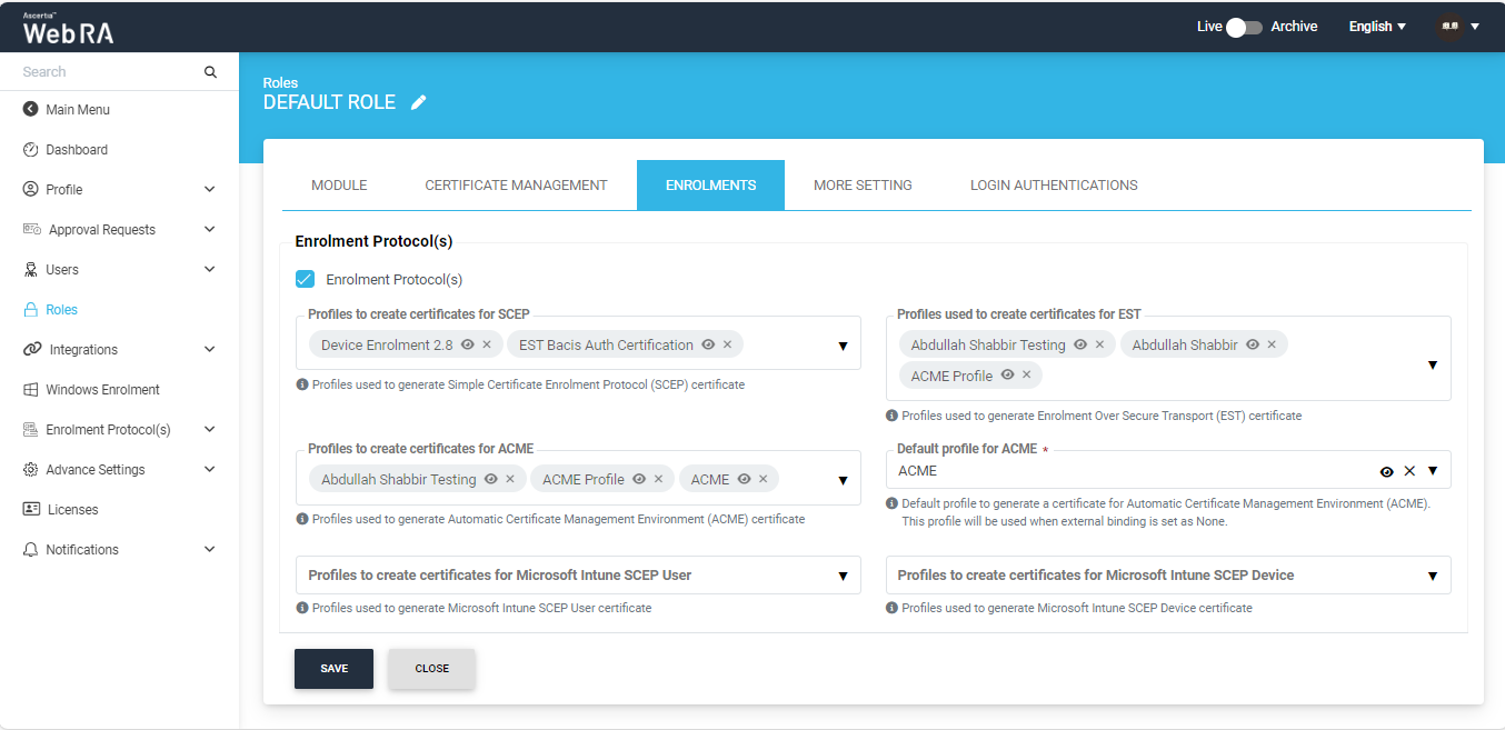 Select this check box to configure profiles with CSR.Then select the profiles that you want to allow for a role that belongs to an enterprise. |