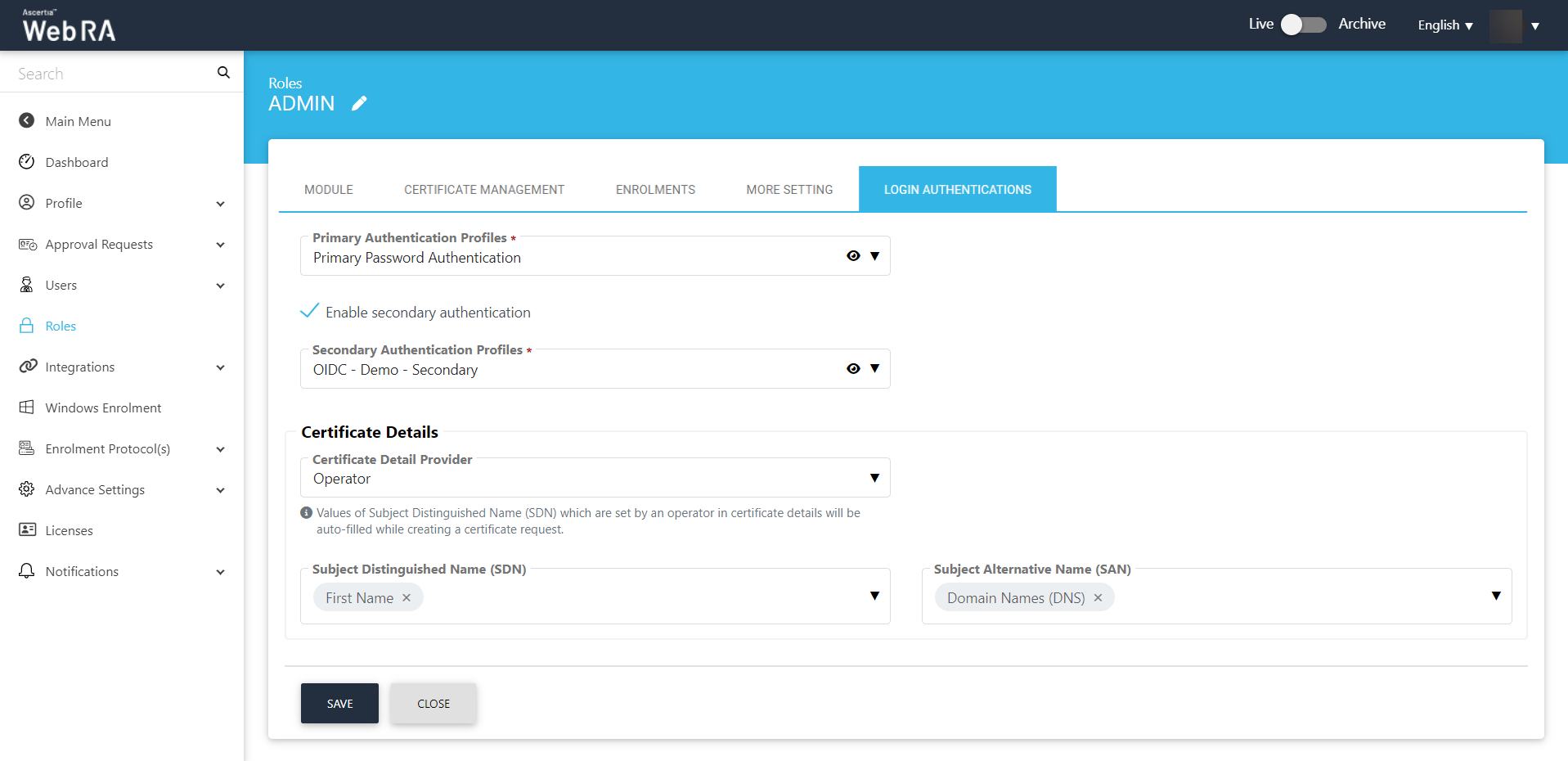 When primary authentication is configured as login authentication, it allows an enterprise RAO to login on ADSS Web RA User Portal through the authentication type that is configured in this profile. An operator can select from multiple primary authentication profiles here. |