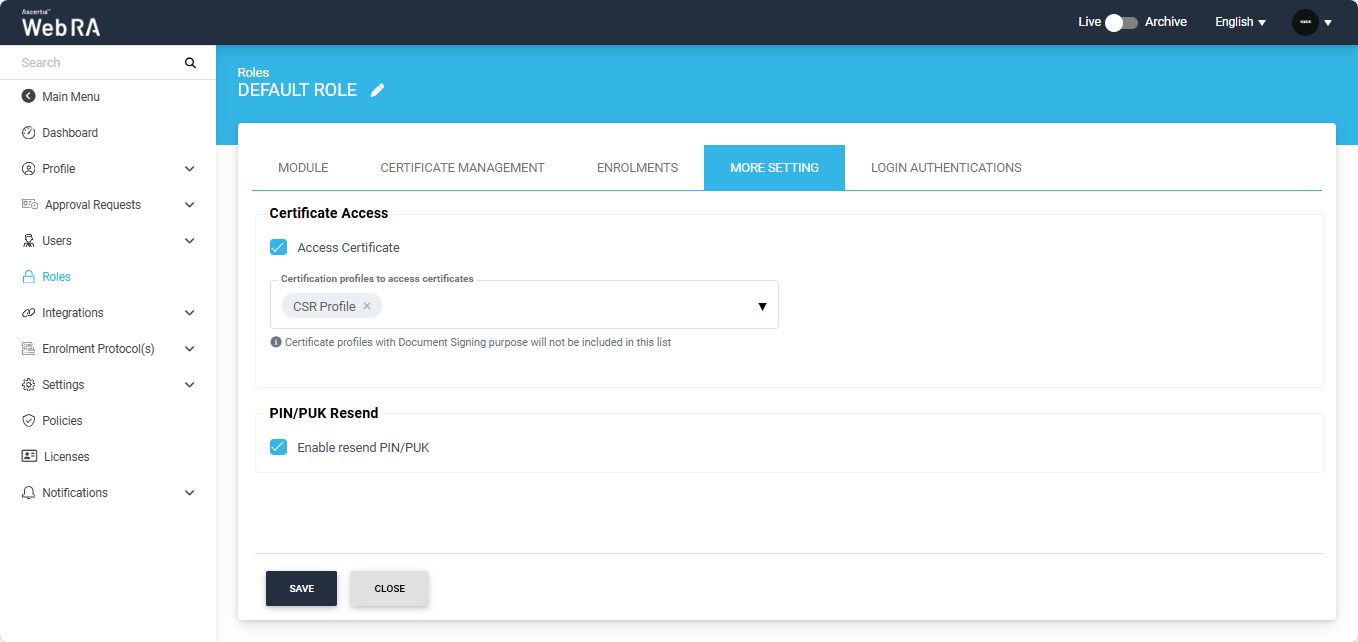 If this checkbox is enabled, users of this enterprise will have the option to receive their PIN/PUK values again via email, SMS, or both, depending on the mechanism selected during the creation of the Certification Profile.