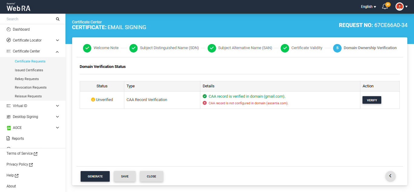 If you attempt to generate the certificate while the Domain Verification Status is ‘Unverified,’ the system will display an error dialog prompting you to verify your domain CAA records before proceeding.