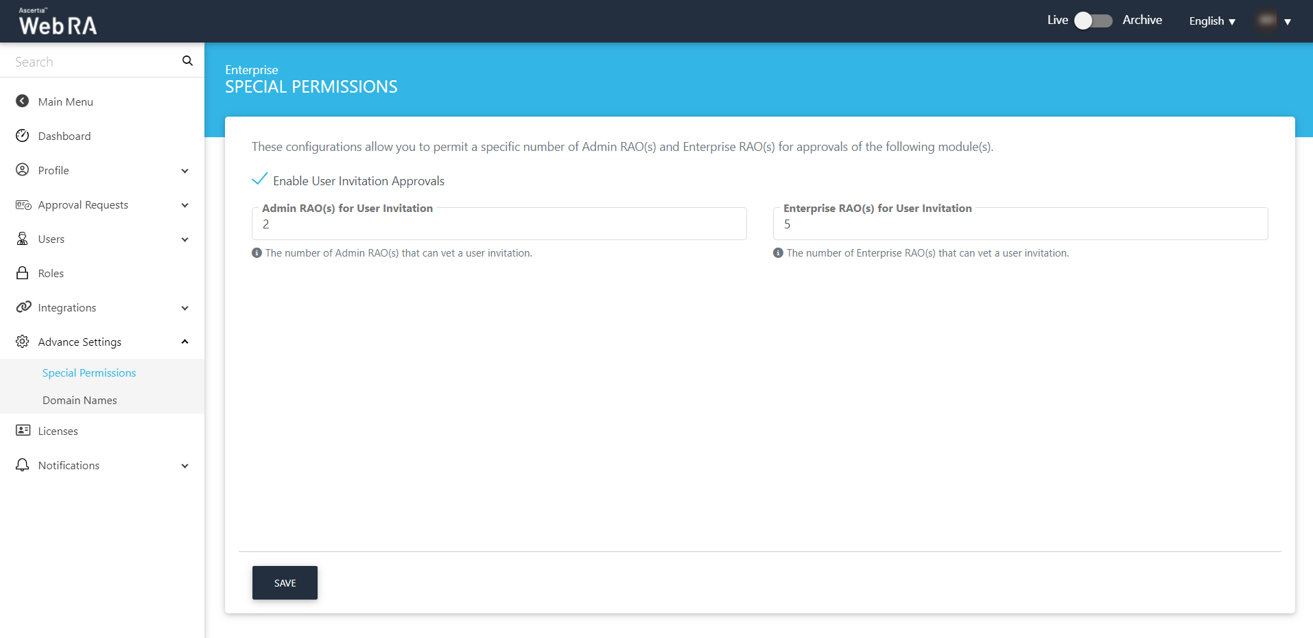 Special Permissions in ADSS Web RA state certain permissions to Admin RAOs and enterprise RAOs on specific modules in the application.