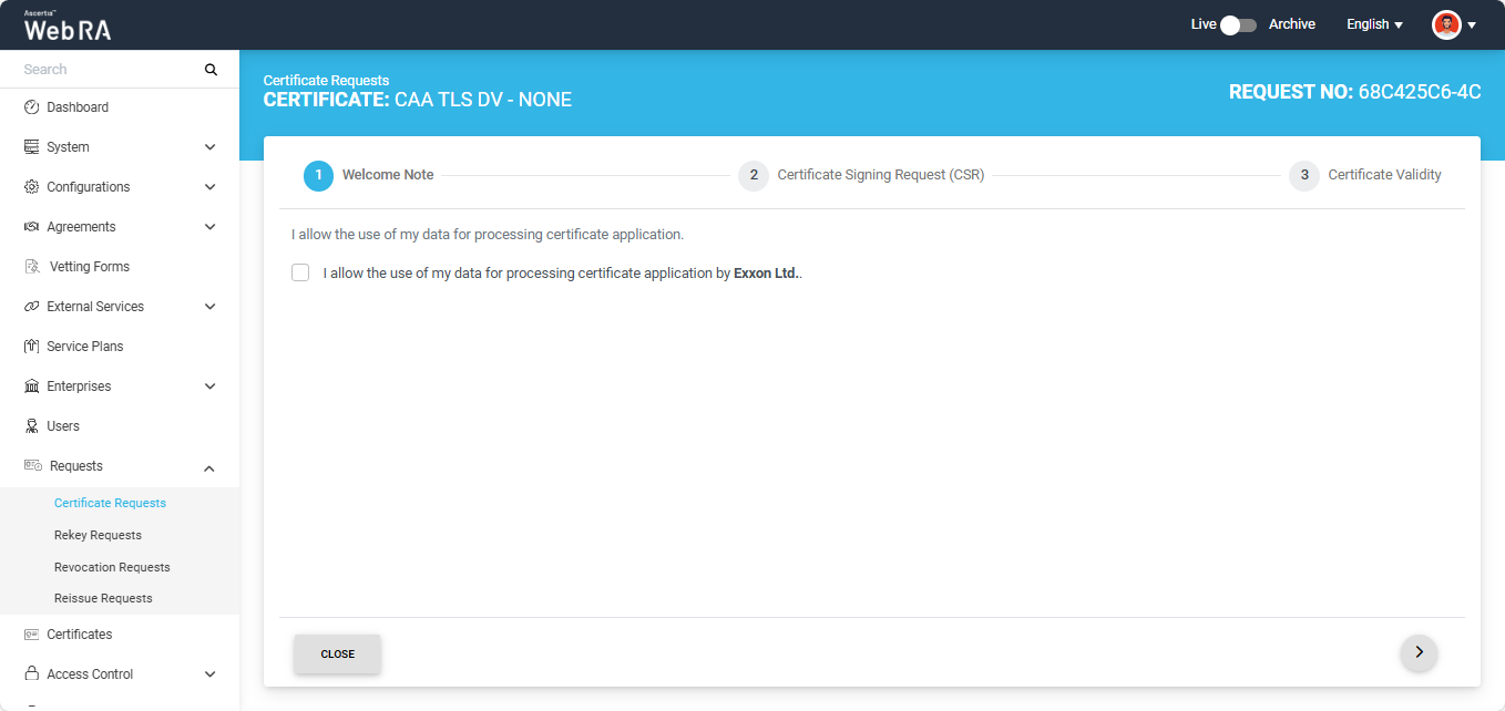 - Submit a Certificate Request based on TLS DV - None (CAA Records)