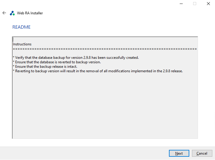 Launch the installer by right-clicking the file name [Web RA Regular Release Installation Directory]/setup/install.bat and select Run as administrator. Follow the installation wizard as described below: