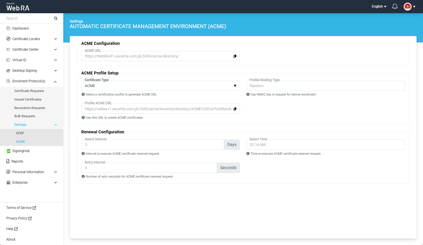 The Profile ACME URL will appear in disabled (read-only) form and is used to create ACME certificates.
