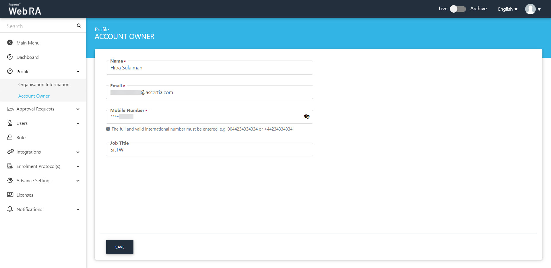It is mandatory to enter the name of the account owner that was created while signing up on ADSS Web RA web portal. |