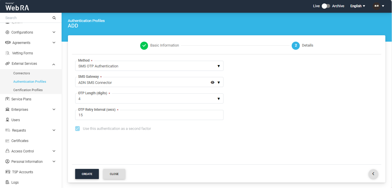 icon on top right. Provide name for the authentication profile, and select authentication method on next screen. On selection of Email/Password Authentication, no option appears to select secondary authentication. If the authentication profile configured under Service Plan is only set as primary, i.e. email/password authentication then it will work same as default ADSS Web RA authentication where user has to provide his email and password credentials. - You can also create an OTP (One Time Password) based authentication, using the following options: