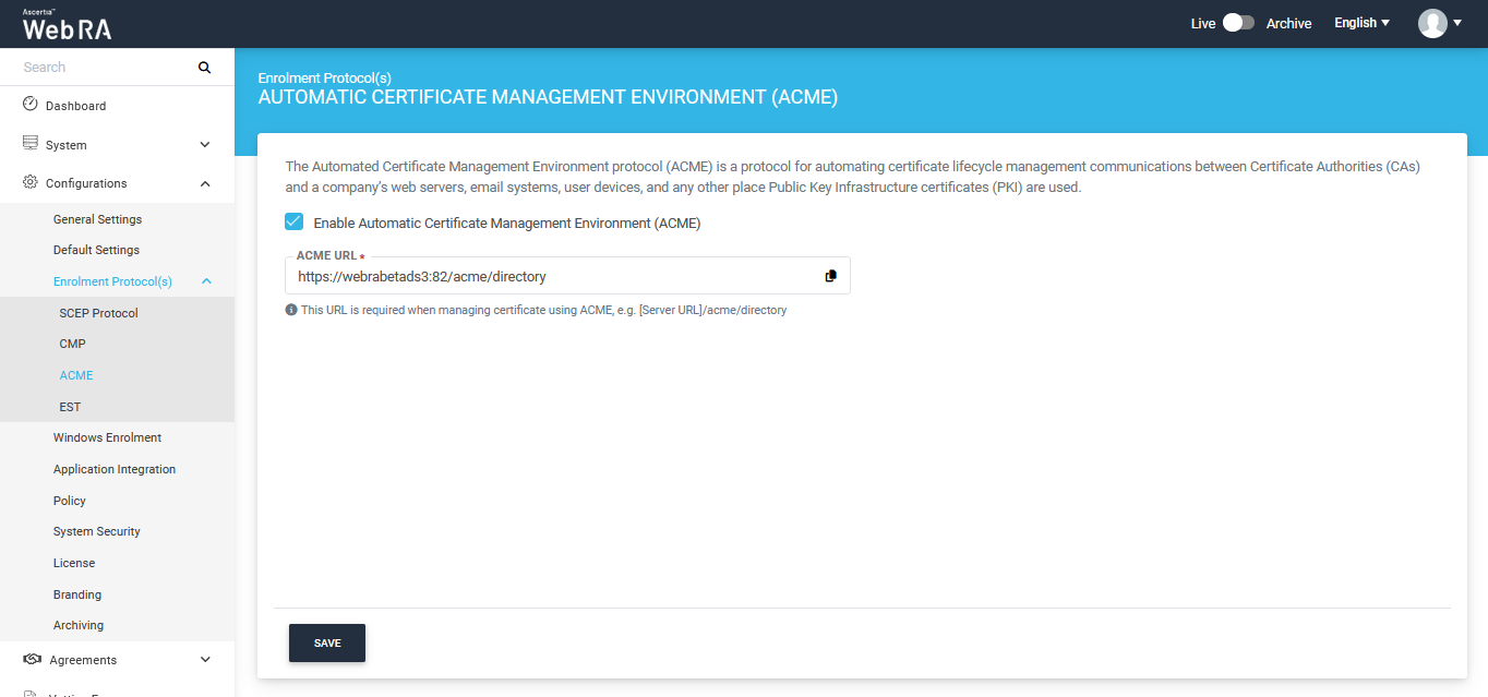 Expand Configurations > Enrolment Protocol(s) > ACME.
