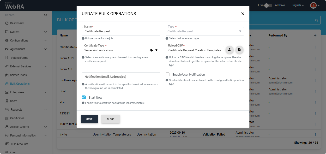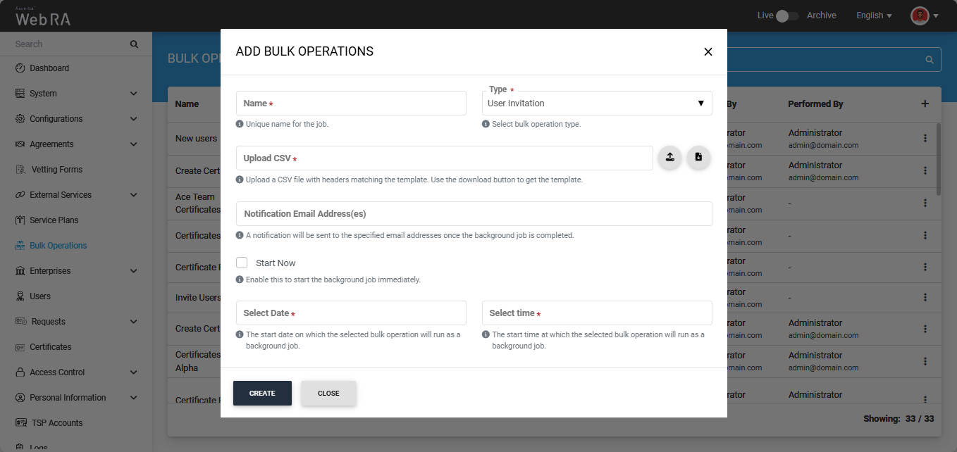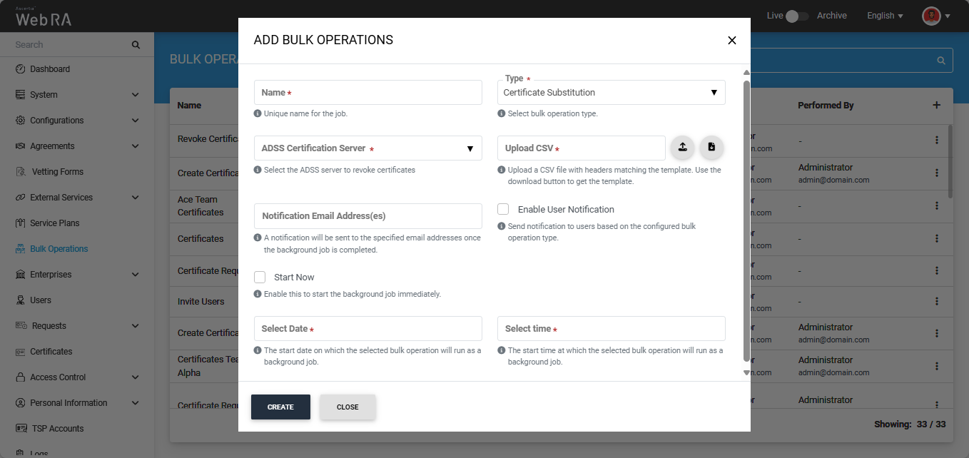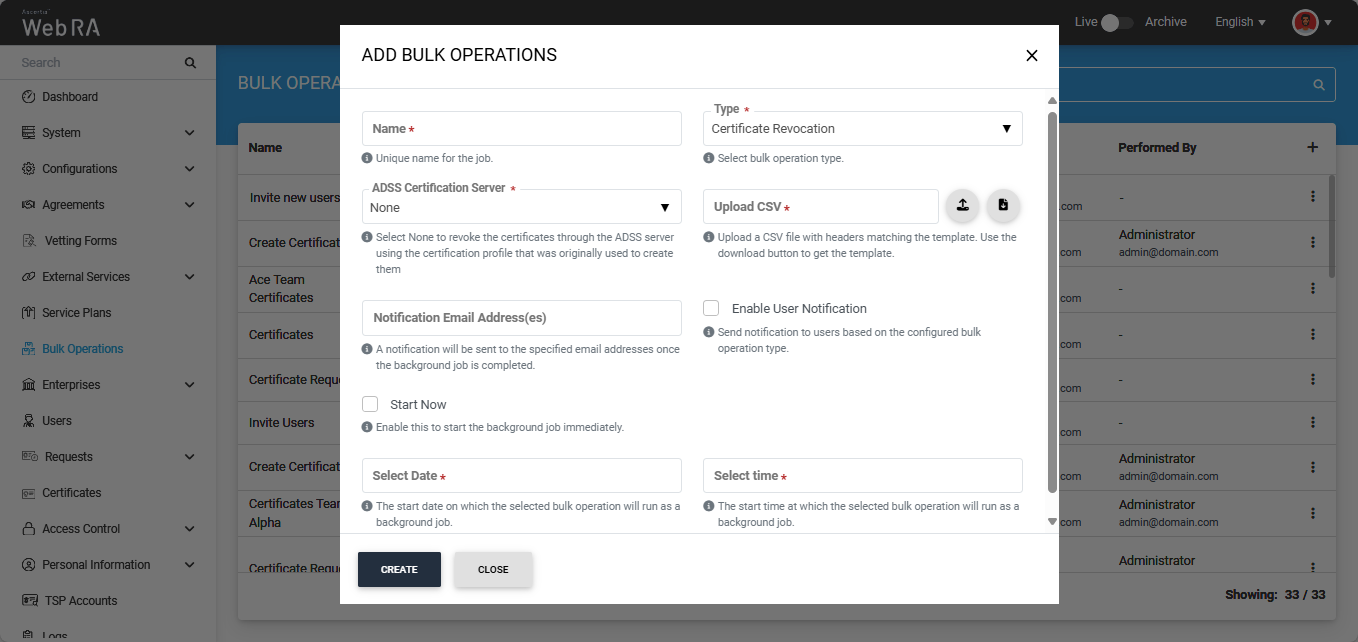 This section of the ADSS Web RA application allows you to configure Bulk Operations Job for the following types: