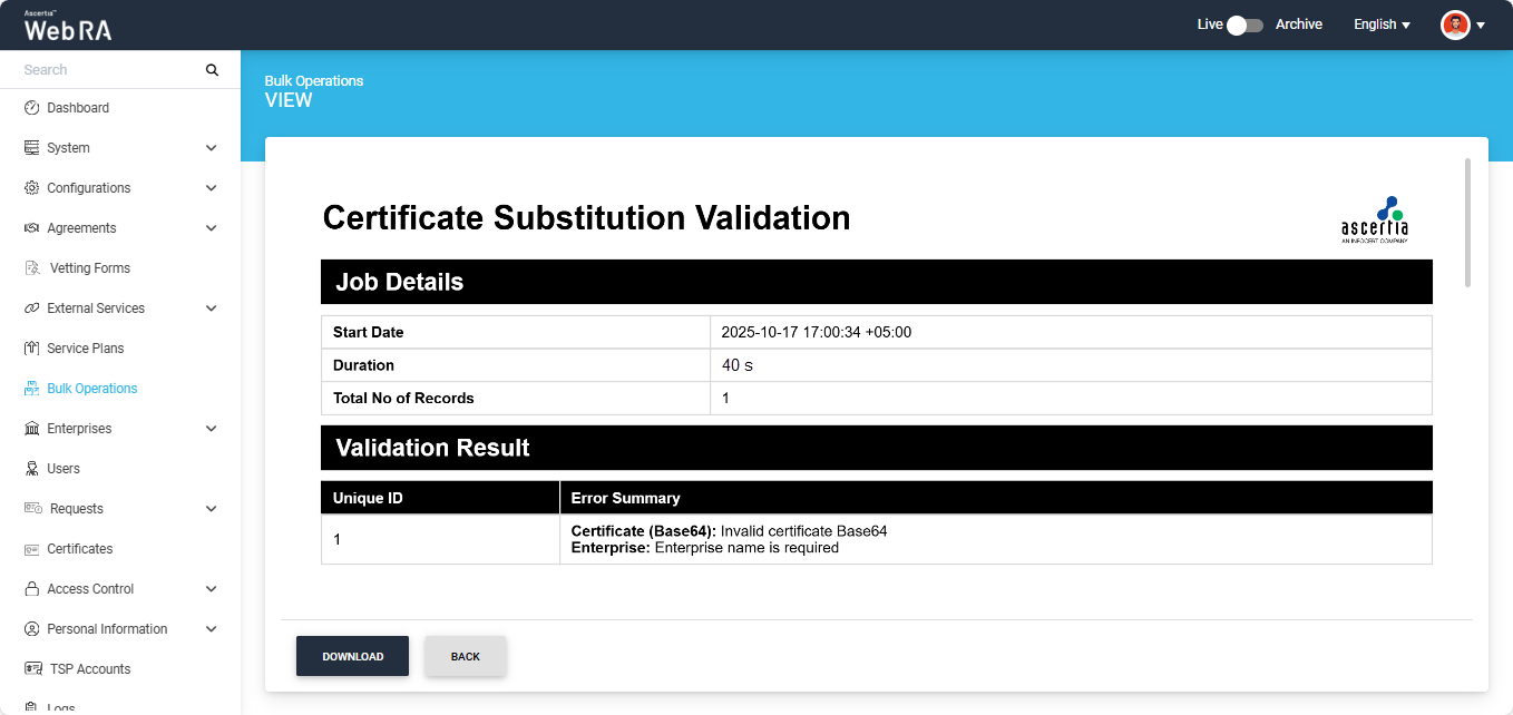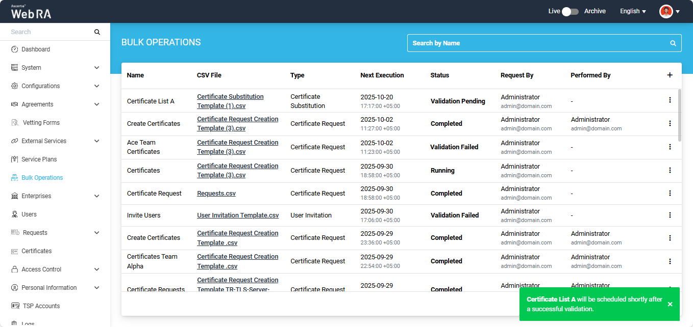 After the job is complete, the system will revoke and substitute the certificates added in the file and generate a report. The new certificate requests in draft mode will also be created in the web portal. These certificates request can later be processed by the users from their respective user portals.
