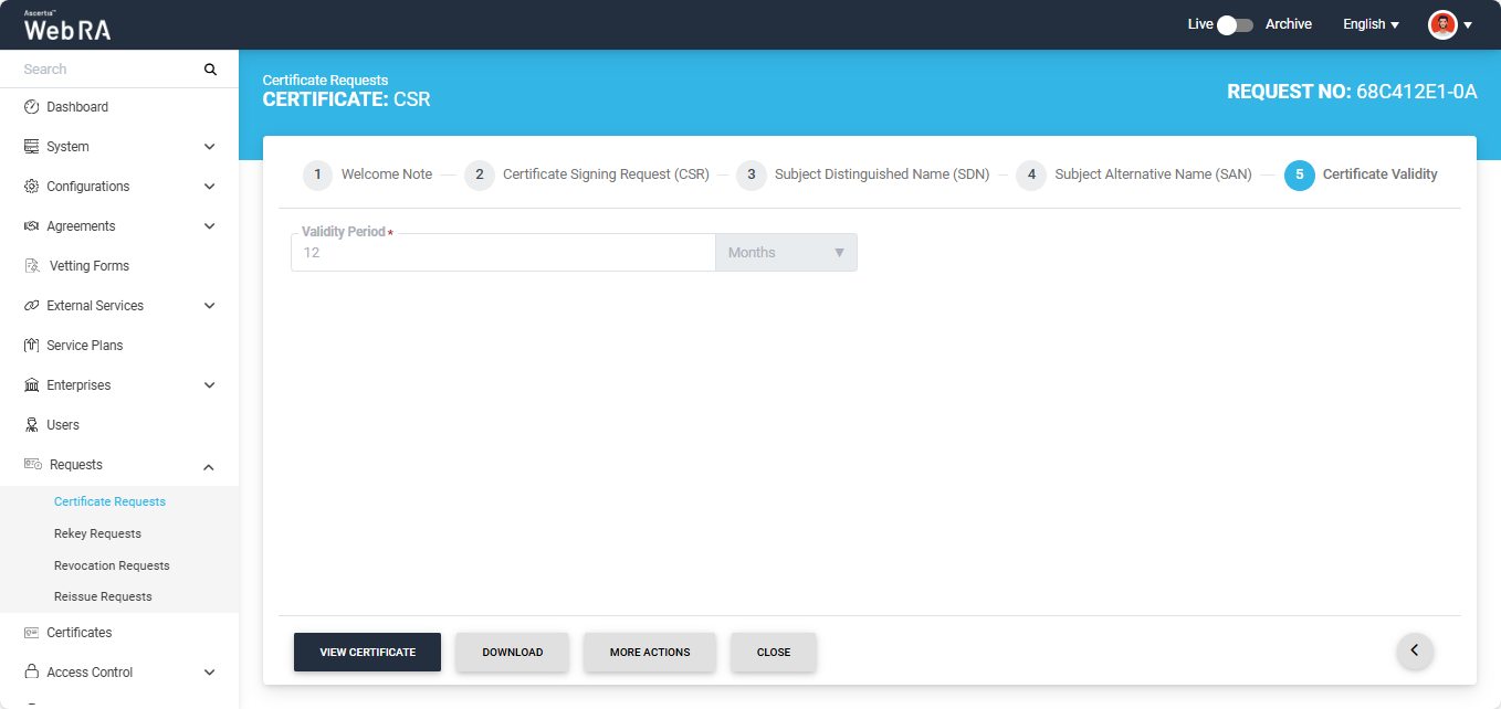 After uploading the CSR, the following screen will appear. You can also view the details of the CSR by clicking on the ‘Eye’ button.