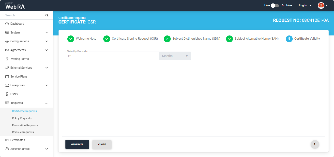 Note: If the ‘Generate a certificate on behalf of the user’ checkbox is enabled, the system will display an additional screen titled ‘User Information’ next to the Certificate Validity screen.