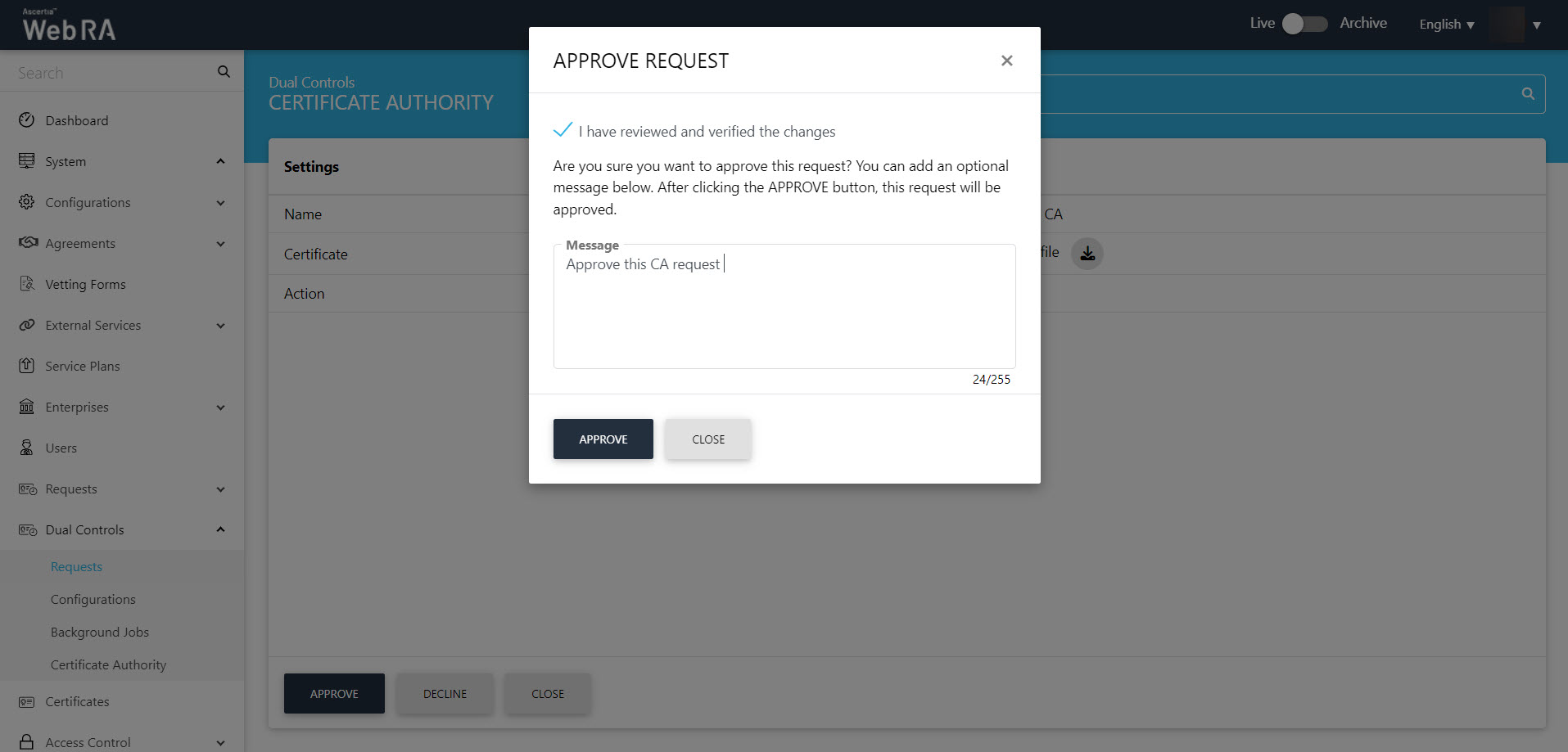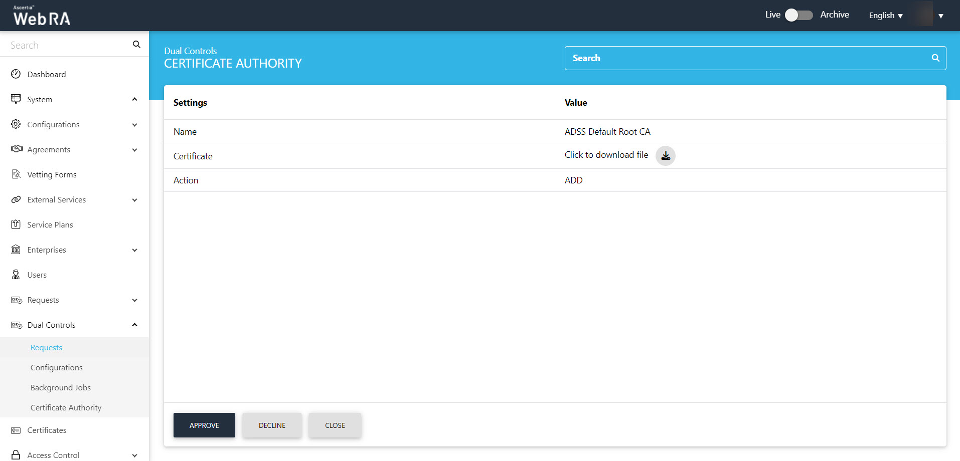 The Certificate Authority screen (path: Dual Control > Request) displays the new CA to the Admin RAO, requested by an enterprise RAO. Admin RAO can review the requests and then process them (Approve or Decline) accordingly.