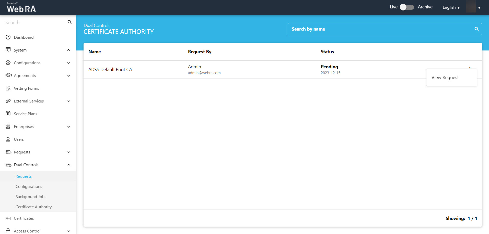 - Expand Dual Control > Certificate Authority from the left menu pane. You will see a pending CA request in the list. Click