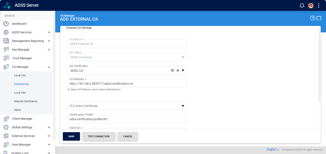 Specify the Client ID that has been configured in the Client Manager module of the ADSS Server for this connector. Note: Use the same Client ID which you used while creating the profile in ADSS Server. |