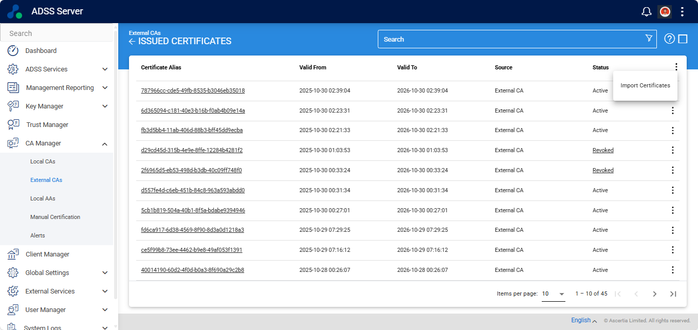 In this guide, you will learn how to import and substitute certificates issued by an external CA in the ADSS Web RA system.