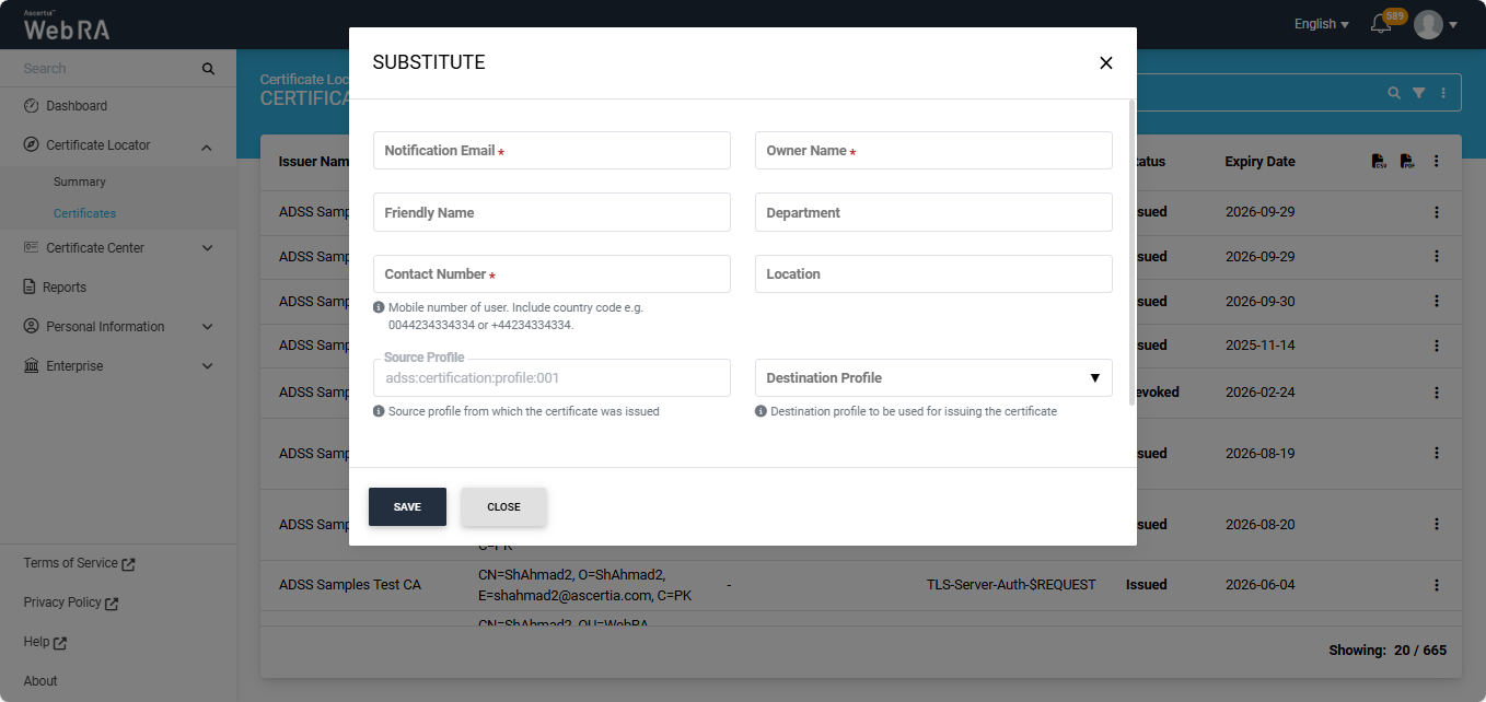 The Certificate Substitution feature has been introduced in the Import Certificates module, allowing operators to revoke existing certificate(s) issued by an external CA and generate new certificate request(s) in the Web Portal using the selected destination profile.