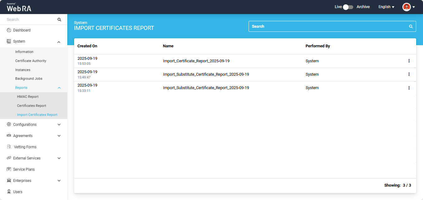 Once the job has been successfully executed, a report will be generated and will appear in the 'Import Certificates Report' page under the 'Systems > Reports' section.